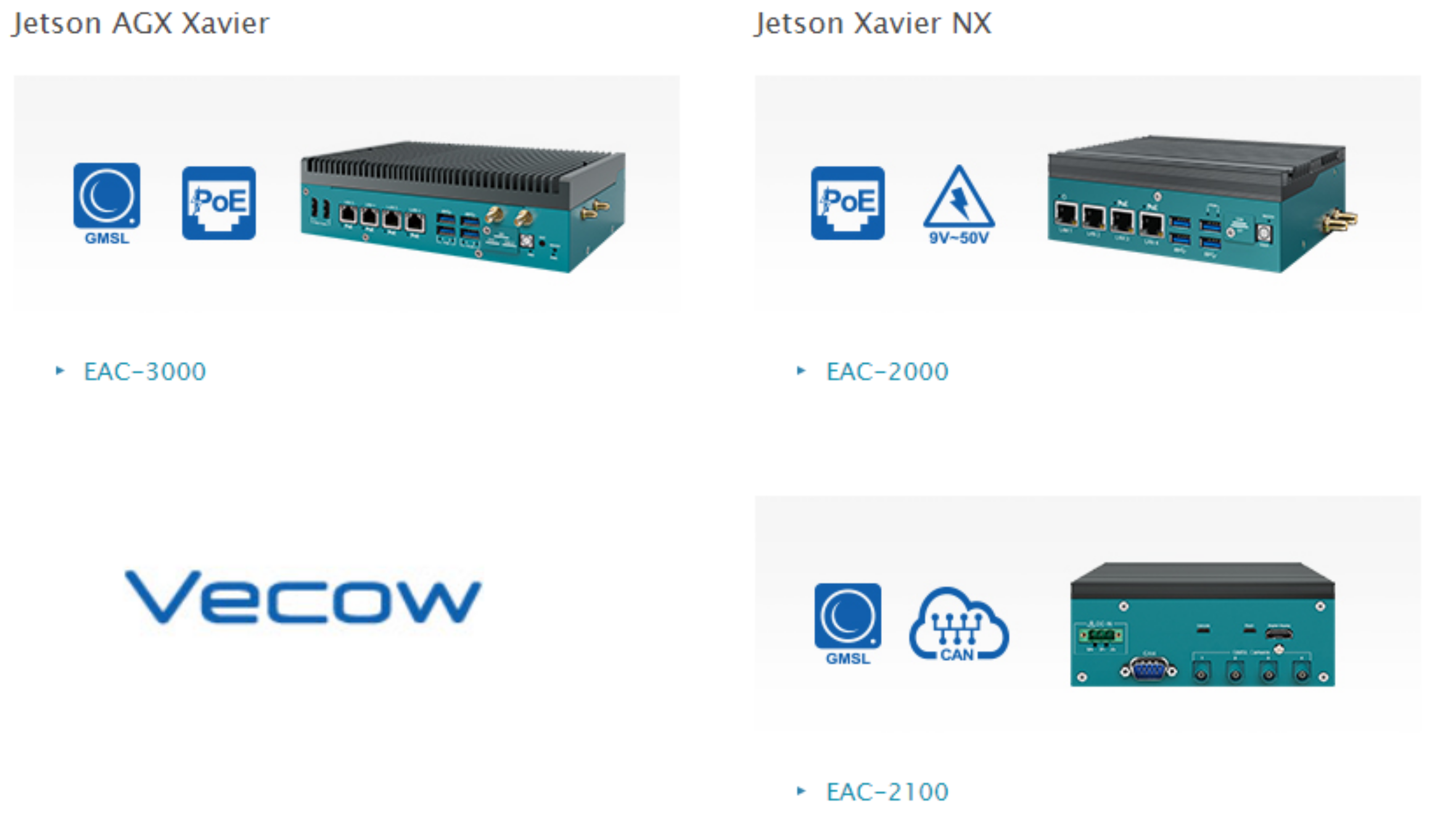 La serie Vecow EAC ofrece configuraciones flexibles y cuenta con funciones listas para usar en vehículo. Admite múltiples tecnologías 5G/4G/LTE/WiFi/BT/GPS y expansiones de almacenamiento compacto a través de M.2 PCIe NVMe SSD y Micro SD. Con conexiones de bus CAN aisladas, protección de control de encendido y compatibilidad con varias interfaces de cámara, la serie EAC de Vecow con tecnología de la plataforma NVIDIA Jetson™ es una buena opción para las aplicaciones Edge AI.